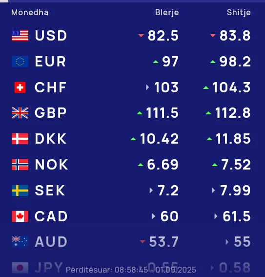 Ndërkohë që edhe franga zvicerane ka shënuar një rënie të lehtë, ku blihet me 103 lekë dhe shitet me 104.3 lekë.