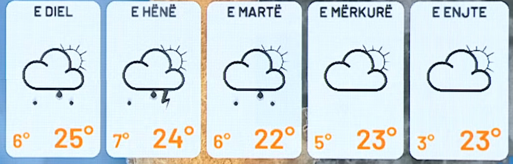 Pavarësisht reshjeve, fundjava do të jetë e ngrohtë për këtë periudhë të vitit — maksimumet do të arrijnë deri në 25°C. Pas së hënës, temperaturat do të pësojnë rënie të ndjeshme, duke shënuar fillimin e një periudhe më të ftohtë në ditët në vijim.