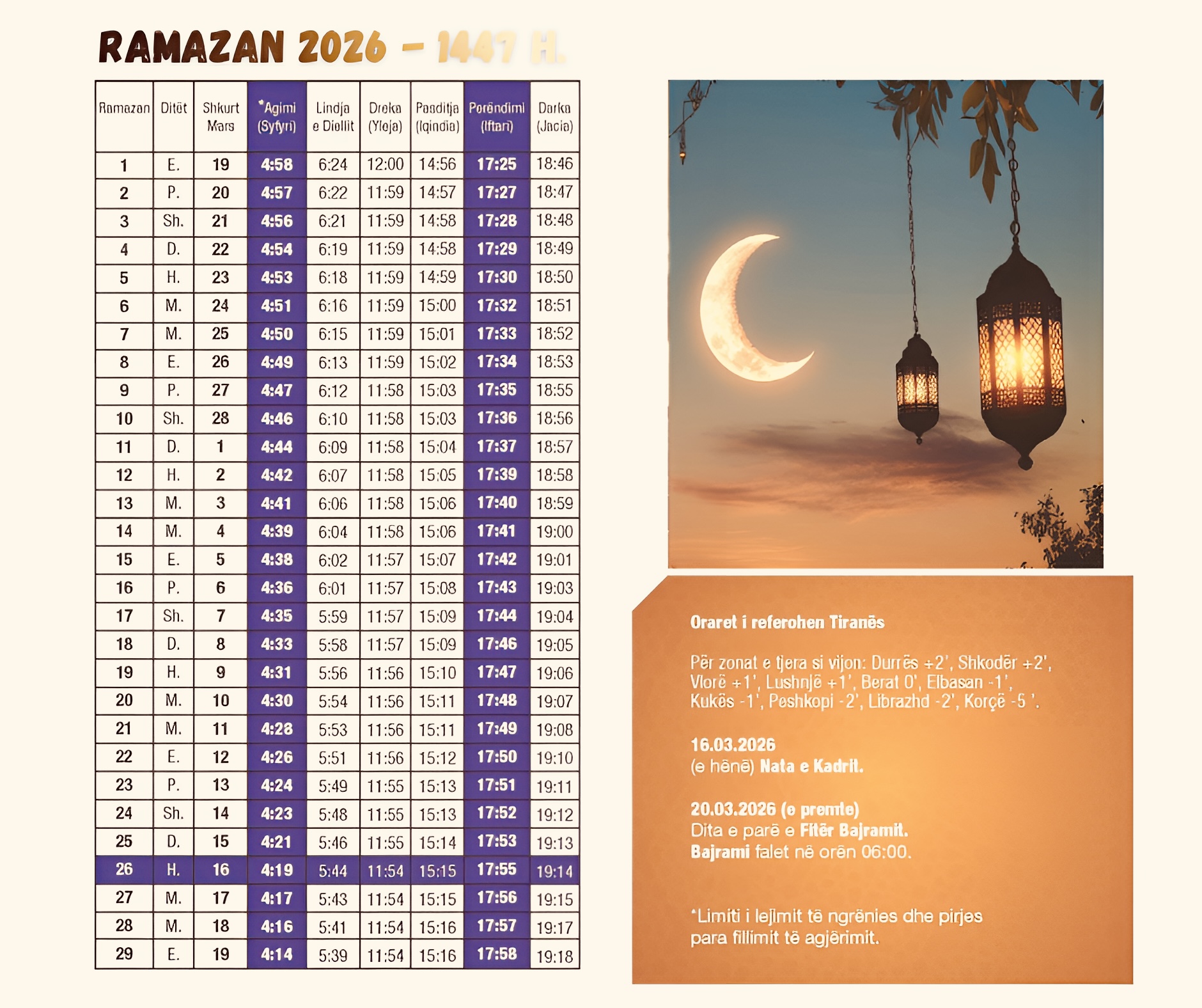 Kalendari i Ramazanit për Shqipërinë – Tiranë, Durrës +2 Shkodër +2 Vlorë+1 Lushnje +1 Berat Elbasan-1 Kukes -1 Peshkopi -2 Librazhd -2 Korce-5 minuta Post Views: 136 previousAksidenti tragjik në Itali me dy viktima, ky është 20-vjeçari shqiptar që humbi jetën