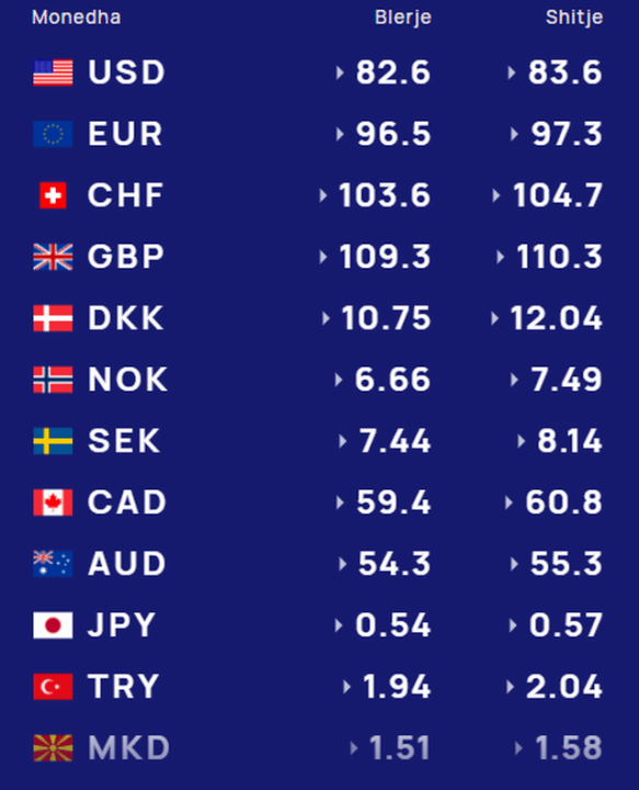 Për kursin e monedhave të tjera shihni tabelën e mëposhtme: