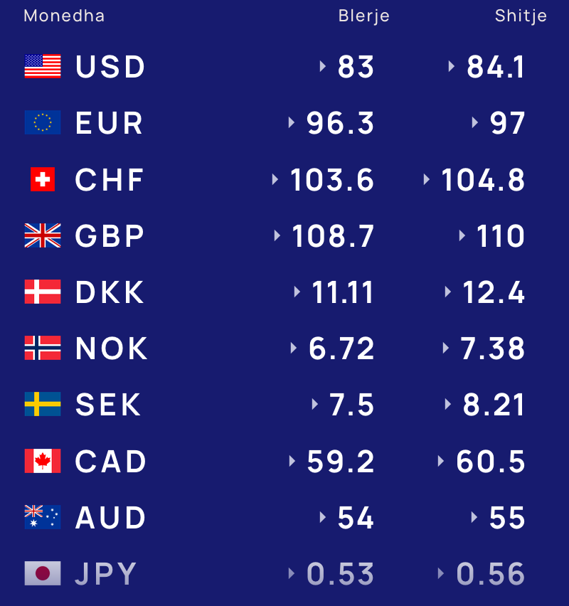 Për kursin e monedhave të tjera shihni tabelën e mëposhtme: