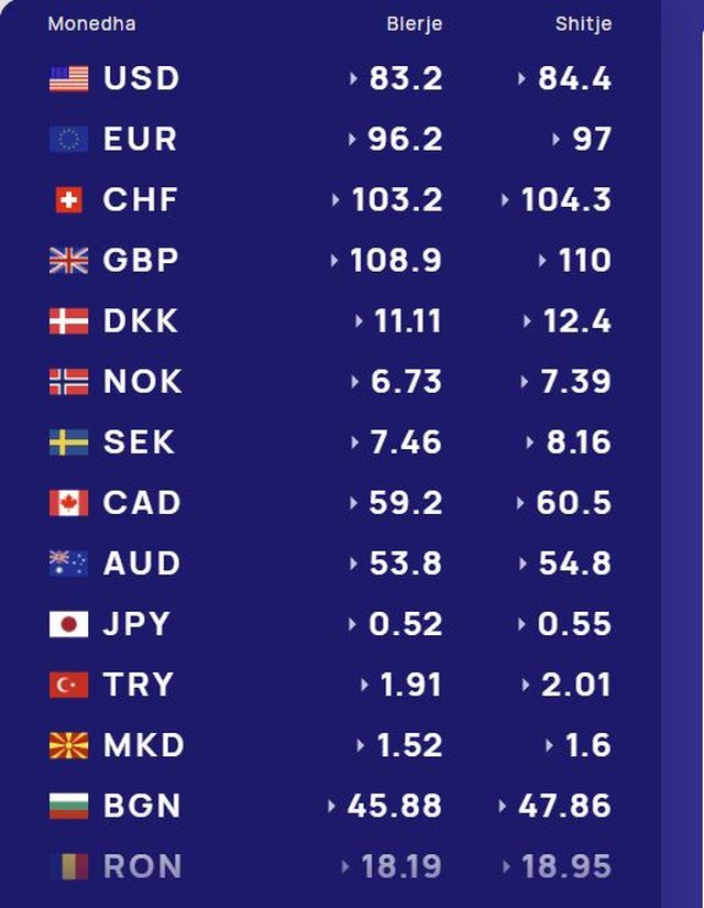 Për kursin e monedhave të tjera shihni tabelën e mëposhtme: