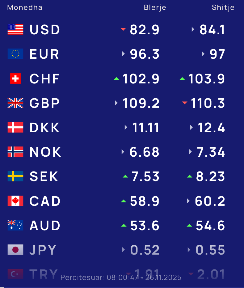 Për kursin e monedhave të tjera shihni tabelën e mëposhtme: