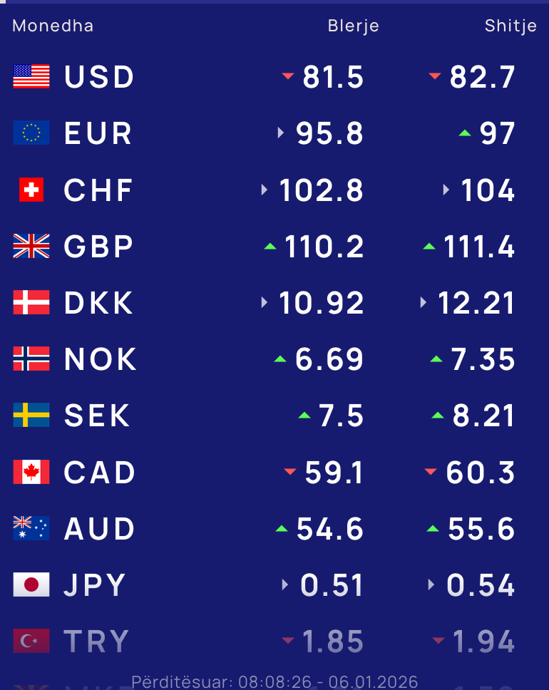 Për kursin e monedhave të tjera shihni tabelën e mëposhtme: