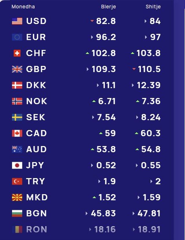 Për kursin e monedhave të tjera shihni tabelën e mëposhtme: