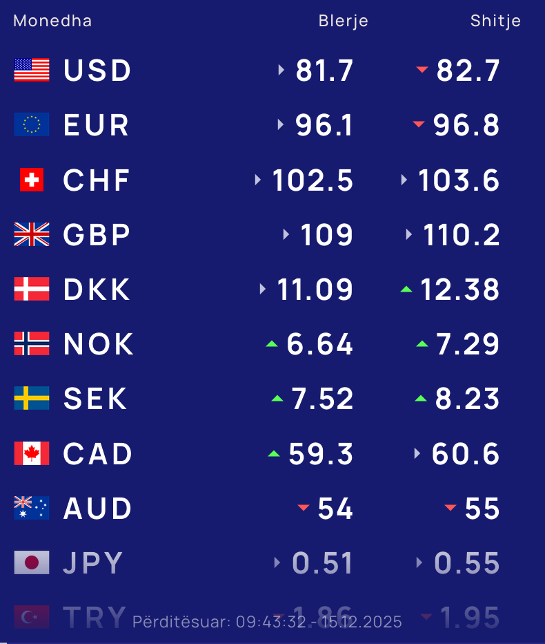 Për kursin e monedhave të tjera shihni tabelën e mëposhtme: