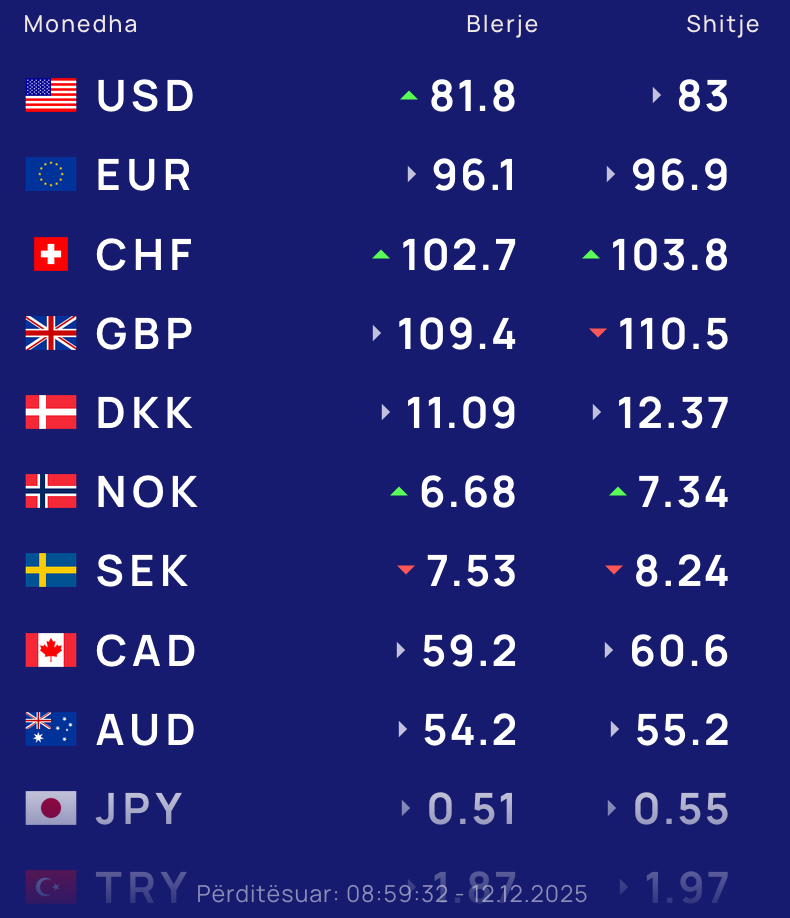 Për kursin e monedhave të tjera shihni tabelën e mëposhtme: