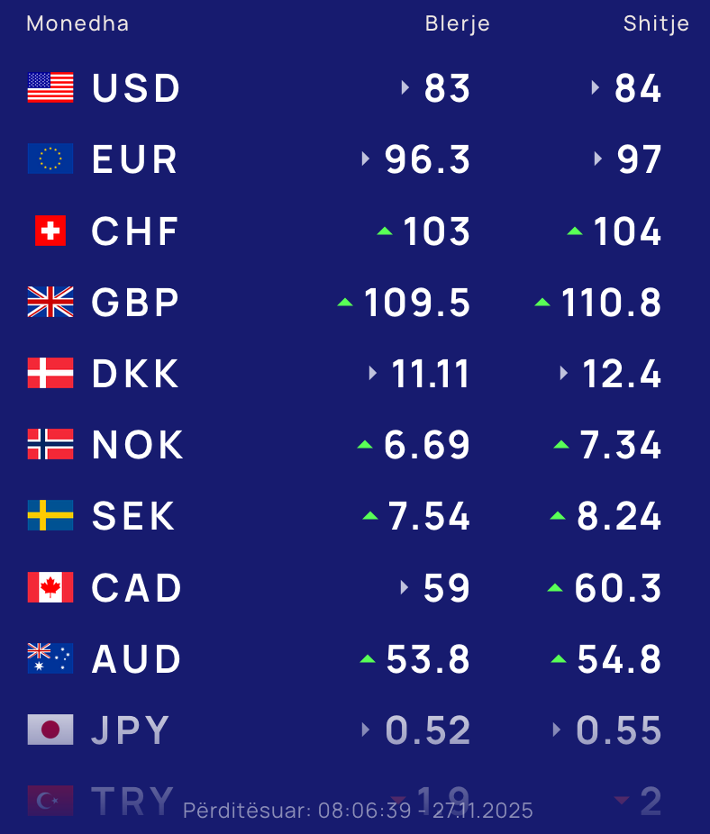 Për kursin e monedhave të tjera shihni tabelën e mëposhtme: