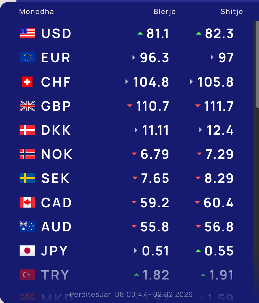 Për kursin e monedhave të tjera shihni tabelën e mëposhtme: