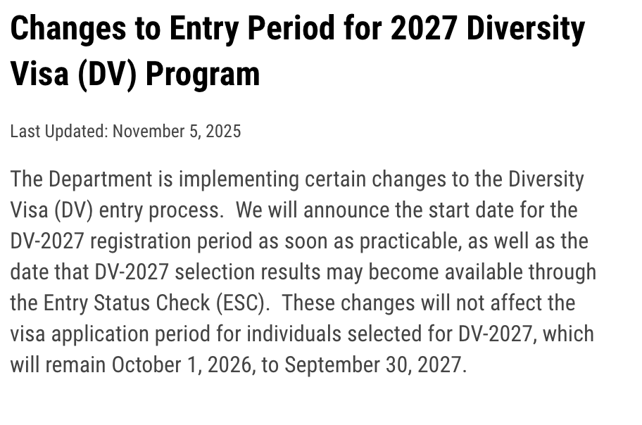 Ndryshimet e paralajmëruara nuk do të ndikojnë periudhën e aplikimeve për vizë për fituesit e DV-2027, e cila mbetet e pandryshuar: nga 1 tetor 2026 deri më 30 shtator 2027.