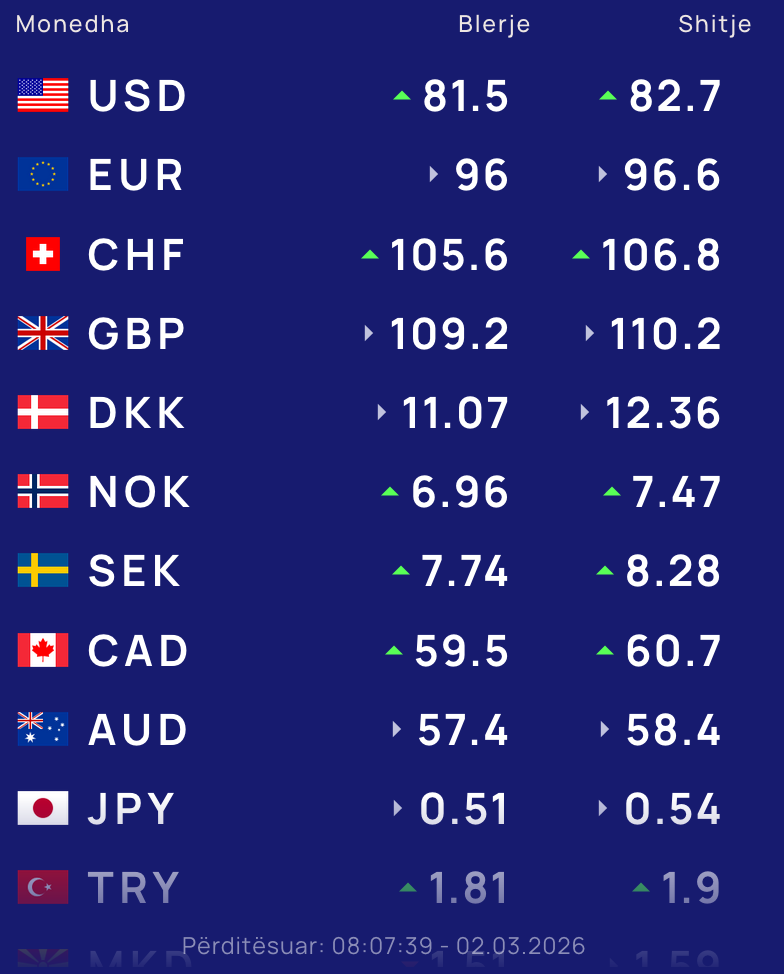 Për kursin e monedhave të tjera shihni tabelën e mëposhtme: