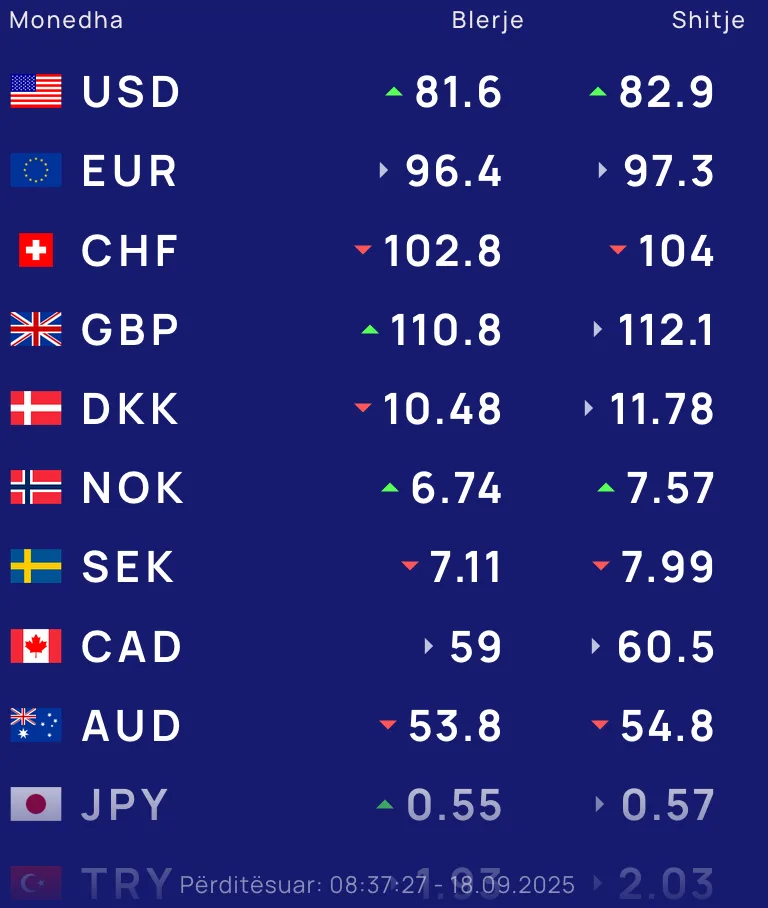 Ndërsa paundi britanik do blihet me 110.8 lekë dhe do shitet me 112.1 lekë.