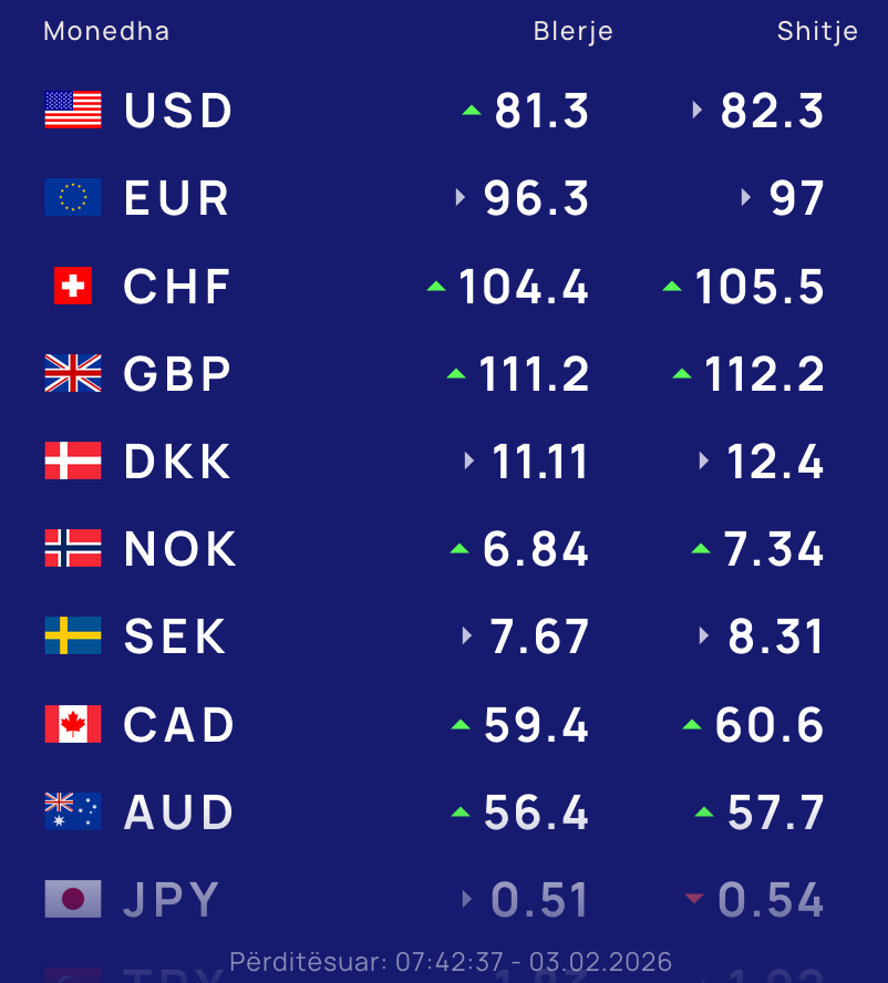 Sot, 3 Shkurt 2026, dollari amerikan blihet me 81.2 lekë dhe shitet me 82.3 lekë.