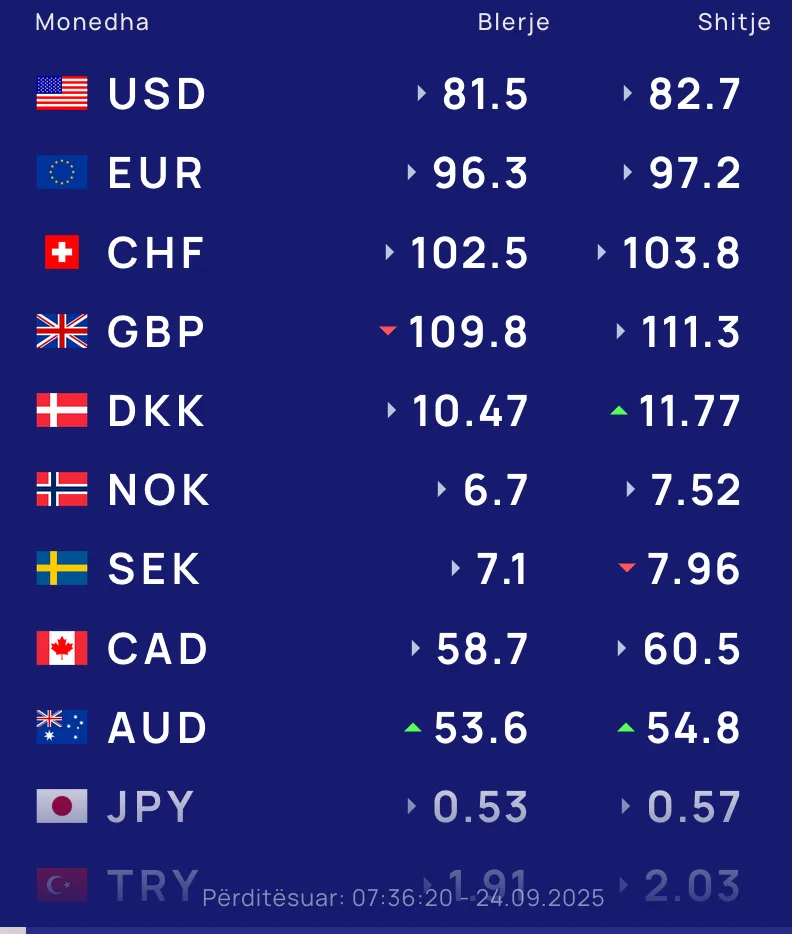 Sot, më 24 shtator 2025, dollari amerikan, blihet me 81.5 lekë dhe shitet me 82.7 lekë.