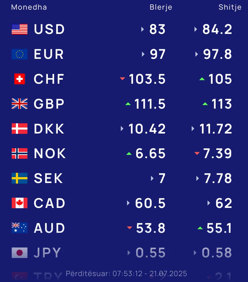 Sot, më 21 korrik 2025, dollari amerikan blihet me 83 lekë dhe shitet me 84.2 lekë.
