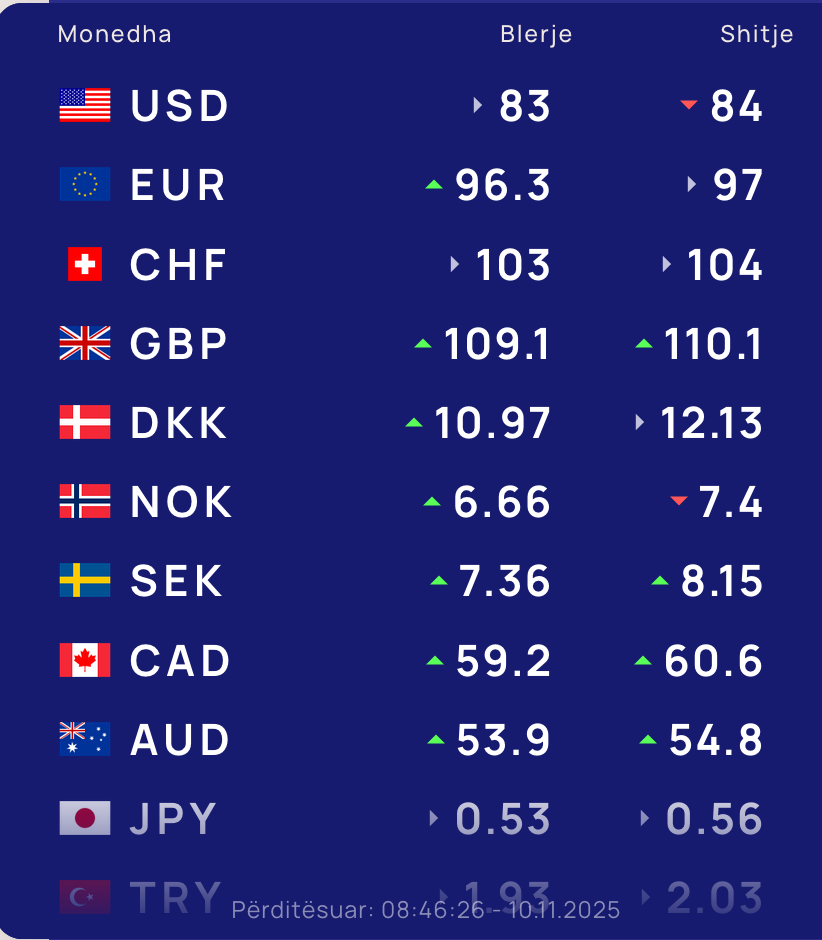 Për kursin e monedhave të tjera shihni tabelën e mëposhtme:
