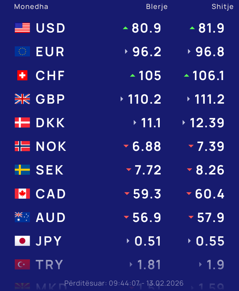 Sot, 13 Shkurt 2026, dollari amerikan blihet me 80.8 lekë dhe shitet me 81.8 lekë.