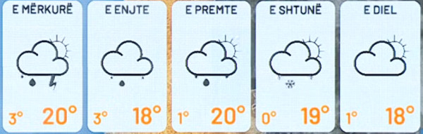 E marta mbetet me reshje të pakta. E mërkura dhe e enjtja sjellin intensifikim të reshjeve, veçanërisht në veri dhe juglindje, ku shiu mund të arrijë intensitet të lartë. E premtja sjell një pauzë të lehtë me reshje të izoluara vetëm në jug dhe pjesërisht në qendër. E shtuna nis me reshje të pakta dhe dëborë në verilindje, por pas mesditës dhe gjatë së dielës moti kthjellohet në të gjithë vendin.