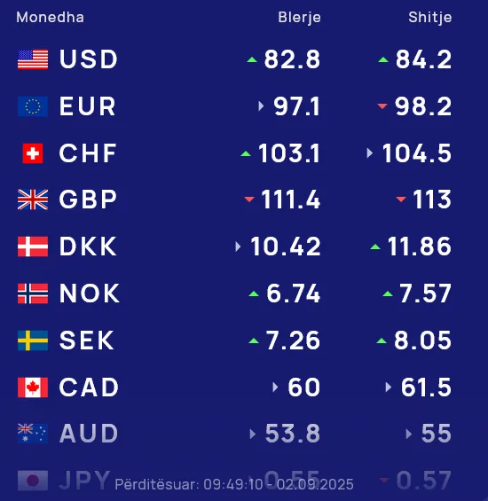 Euro këmbehet me 97.1 lekë në blerje dhe 98.3 lekë në shitje. Franga zvicerane ka një kurs prej 103 lekësh në blerje dhe 104.5 lekësh në shitje.