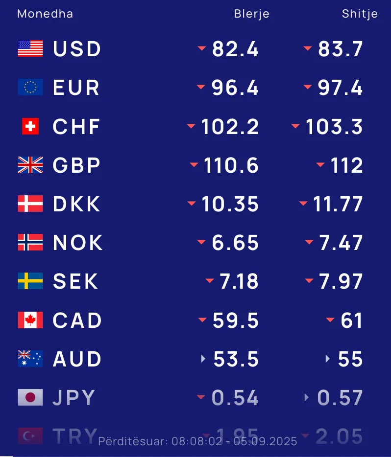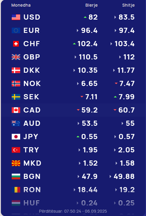 Ndërsa paundi britanik do blihet me 110.5 lekë dhe do të bëj shitet me 112 lekë.