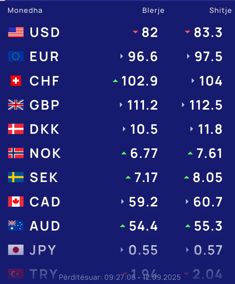 Ndërsa paundi britanik blihet me 111.2 lekë dhe shitet me 112.5 lekë.