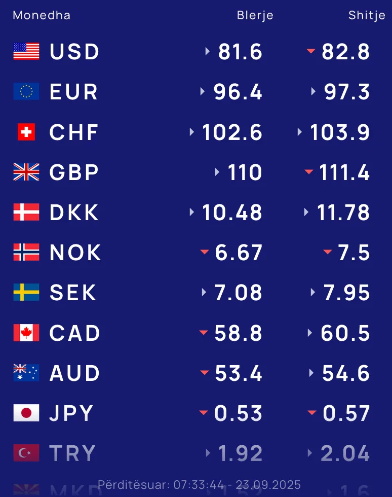 Franga zvicerane do të blihet me 102.6 lekë dhe do të shitet me 103.9 lekë, ndërsa paundi britanik do të këmbehet me 110 lekë në blerje dhe 111.4 lekë në shitje.
