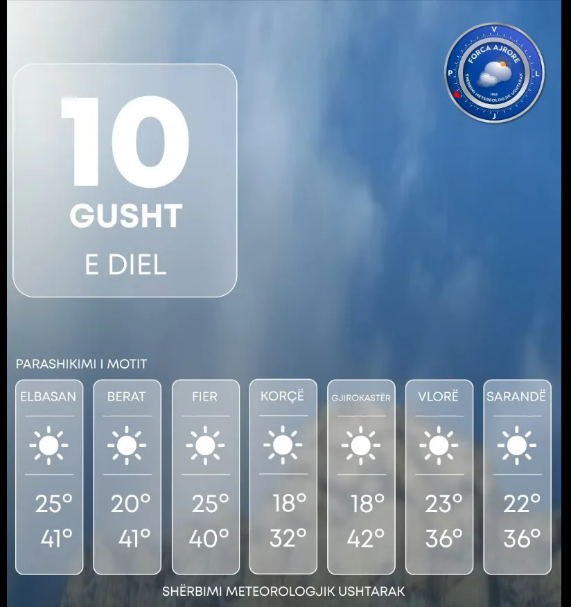 Moti parashikohet i kthjellët në tyë gjithë territorin. Mot i nxehtë.