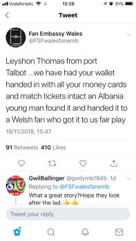 Por një i ri shqiptar ia kishte kthyer portofolin me gjithçka që kishte brenda të paprekur. Lajmi bëhet i ditur nga grupi i tifozëve nga Wellsi në Twitter ‘FSFWalesfanemb” që ndër të tjera shkruan se portofolin e Leyshon Thomas e ktheu një djalë i ri shqiptar dhe asgjë nuk ishte prekur brenda.